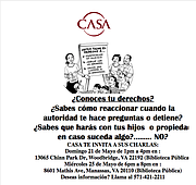 CASA estará organizando charlas de conozca sus derechos en las bibliotecas públicas deWoodbridge y en Manassas. Conversarán acerca de sus derechos en caso de que tenga un encuentro con la autoridad y que hacer con su propiedad o con sus hijos en caso lo detengan.
