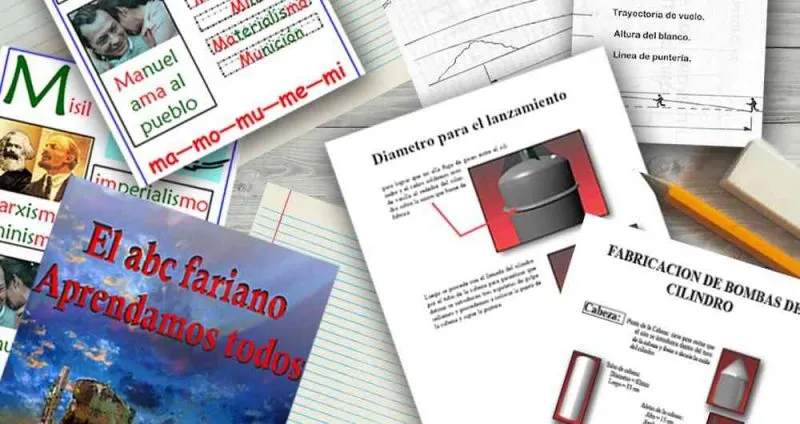 A modo de las cartillas que se usaron por años en la educación tradicional, este “abc fariano” enseña a leer y a escribir. Para eso, ilustra cada letra del alfabeto con algunas palabras. Lo peculiar son los ejemplos que usa, aplicados al contexto de la guerra. Por la b, bomba; por la f, fusil; por la h, hoz; por la J, Jacobo, acompañado de la foto de su fundador Jacobo Arenas; por la m, marxismo y misil. La tradicional frase “Mi mamá me mima” termina parodiada en un “Manuel (Marulanda) ama al pueblo”.