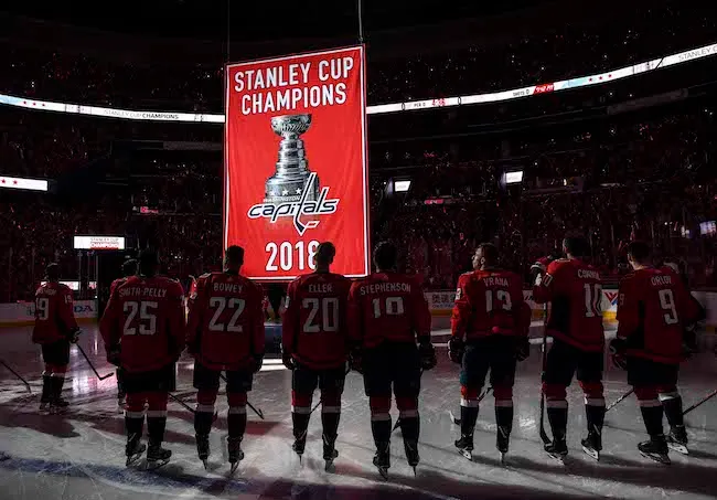 “We Are The Champions” se tocó mientras el tablero de video mostraba un montaje de las ruidosas celebraciones de verano de los Capitals, que presentaban apropiadamente un montón de cantos eufóricos de “We Are The Champions”. Cuando terminó, Ovechkin recogió la Copa Stanley y la colocó en el hielo para que los Capitals pudieran obtener una última foto, esta vez con el nuevo estandarte del campeonato detrás de ellos.