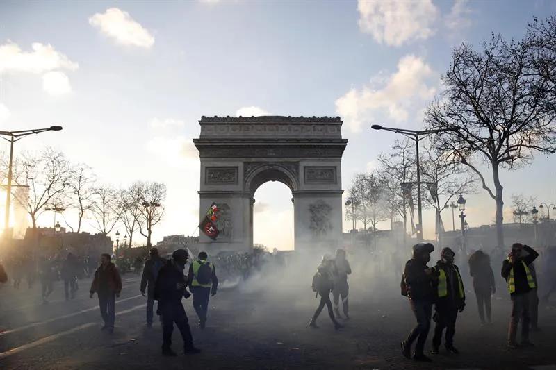 FRANCIA. Manifestantes de los "Gilets Jaunes" (chalecos amarillos) se paran entre el humo de los Campos Elíseos durante la manifestación del "XVIII acto" (la decimoctava protesta nacional consecutiva de un sábado) en París.