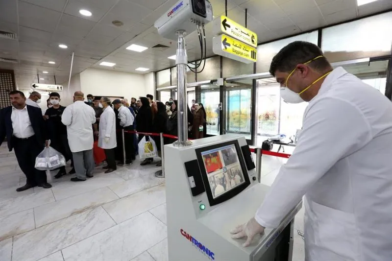 Crédito: ALEX PLAVEVSKI / EFEENFERMEDAD. Un guardia de seguridad con máscara y equipo de protección mide la temperatura corporal de los visitantes a la entrada de un banco en Guangzhou, provincia de Guangdong, China, 24 de febrero de 2020