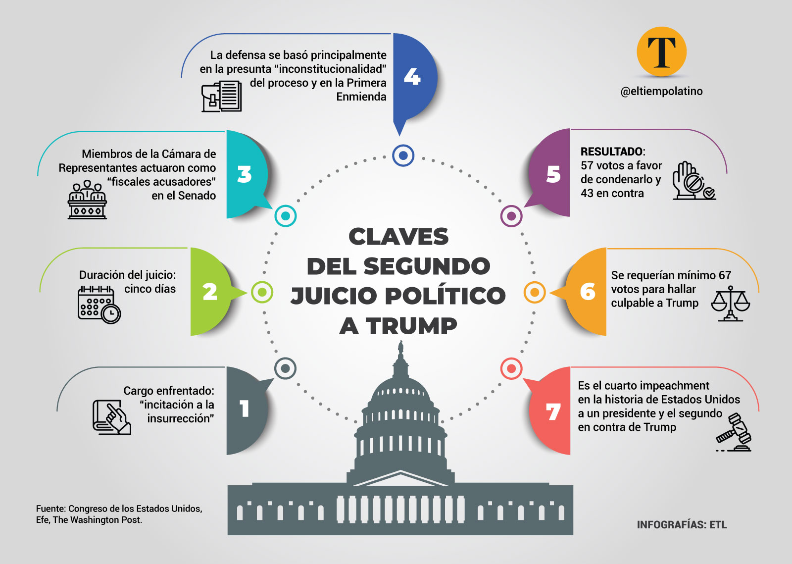 Donald Trump superó el segundo juicio político en su contra en el Senado, donde la votación quedó en 57 senadores pidiendo la condena contra 43 demandando la absolución, el sábado 13 de febrero. No se logró el objetivo del impeachment, pues se requería el apoyo de mínimo 67 senadores; pero los demócratas elevaron el debate sobre la responsabilidad del expresidente en el asalto al Capitolio, con posibles consecuencias en el futuro.
