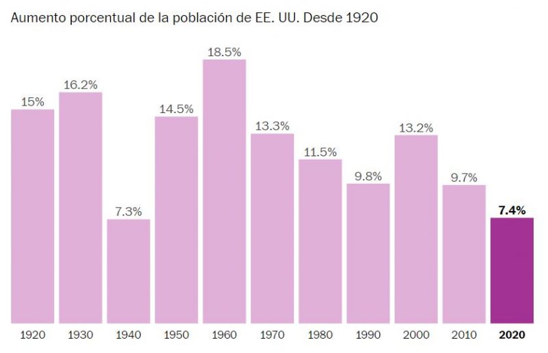 Es la segunda tasa de expansión más lenta desde que el gobierno comenzó a realizar un censo, en 1790. En la década de 1930, con el crecimiento demográfico más lento, la tasa era de 7,3%.