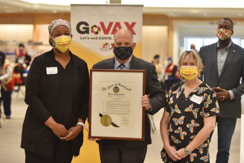 El gobernador Larry Hogan visitó este jueves el sitio de vacunación masiva del condado de Howard ubicado en The Mall en Columbia. El republicano estuvo acompañado por el secretario Dennis Schrader, del Departamento de Salud de Maryland, el ejecutivo del condado de Howard Calvin Ball y la general de brigada Janeen Birckhead.