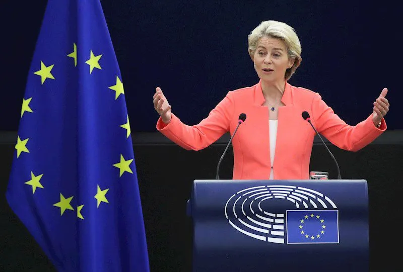 La presidenta de la comisión europea, Ursula von der Leyen, durante su discurso sobre el estado de la UE hoy 15 de septiembre, 2021. Foto: EFE/EPA/YVES HERMAN / POOL.