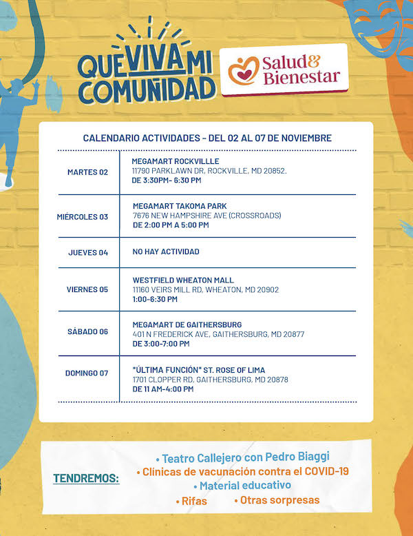 Entre las actividades programadas para acercarse a la comunidad y para generar interés en la vacunación, la Iniciativa Por Nuestra Salud y Bienestar junto a las autoridades del condado, se apoyan en espectáculos de teatro callejero para que el mensaje llegue a cuantos latinos sea posible.