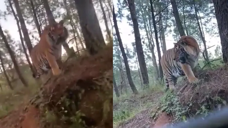 "Levanta la ventana más", se escucha decir a la voz de un hombre en un vídeo filmado con la mano temblorosa desde un automóvil en movimiento mientras un tigre de Bengala entra en el marco. “De ninguna manera, es enorme”, respondió una mujer asustada.