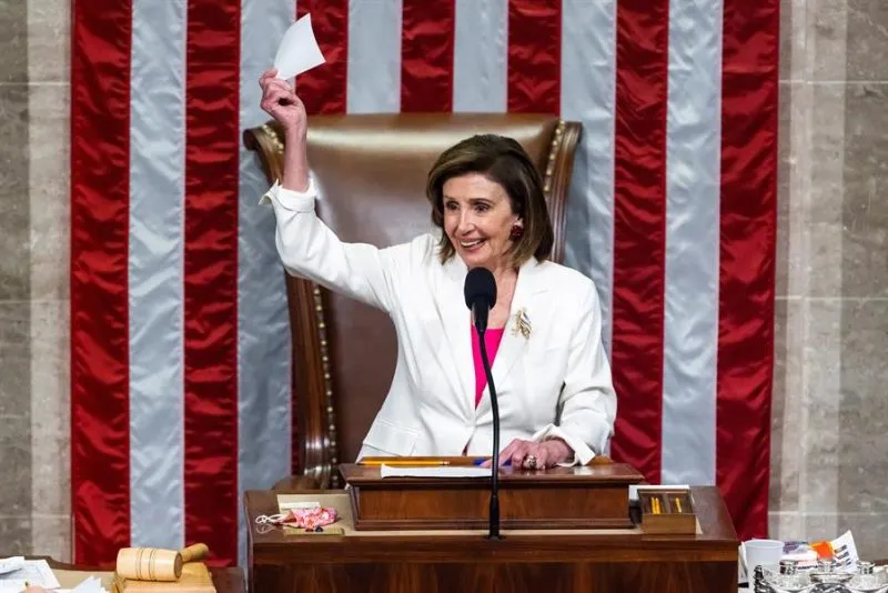 La presidenta de la Cámara de Representantes, Nancy Pelosi, agita el recuento de votos después de que la Cámara aprobara el proyecto de ley Build Back Better el 19 de noviembre de 2021 | Foto EFE/EPA/JIM LO SCALZO