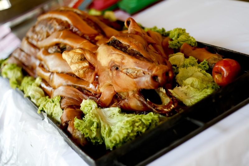 También se acostumbra acompañarlo con un plato de verduras con tiras de carne cruda bien tratada y los lechones o cerdos nunca pueden faltar.