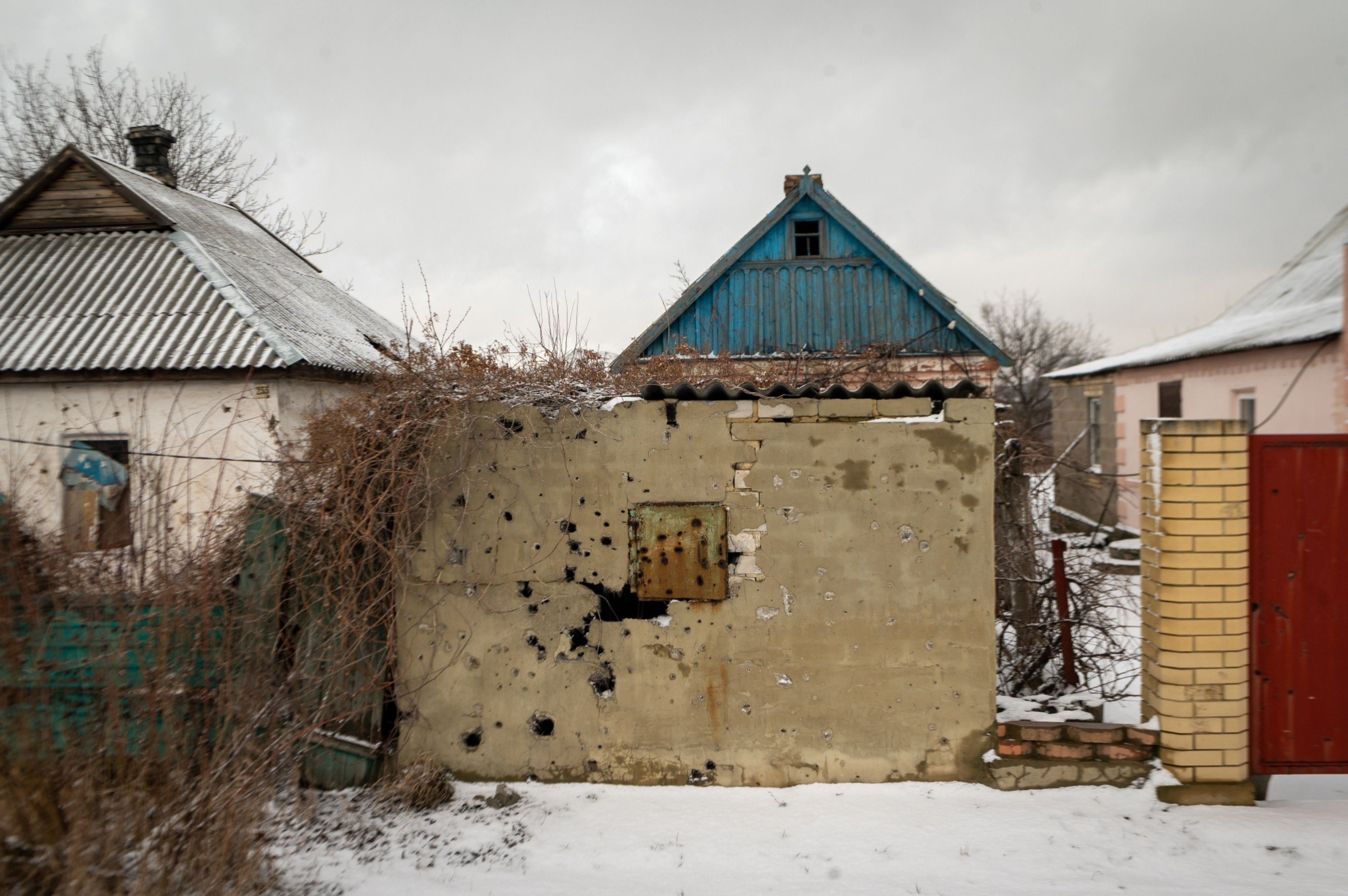 Una abolladura a la altura de la cabeza en el armario del pasillo muestra dónde una bala atravesó la ventana y saltó para golpear el refrigerador. Han tapiado con ladrillos esa ventana y otras que daban al jardín. Más allá se encuentran los abandonados pozos de minas y los montones de escoria rocosa que desde 2014 han marcado el territorio separatista respaldado por Rusia de la autoproclamada República Popular de Donetsk, o DNR.