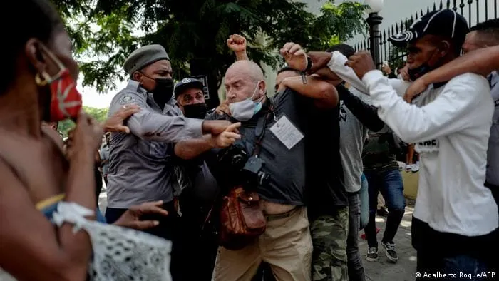Un fotógrafo español de la agencia de noticias AP es agredido por funcionarios durante las protestas del 11 de julio de 2021.