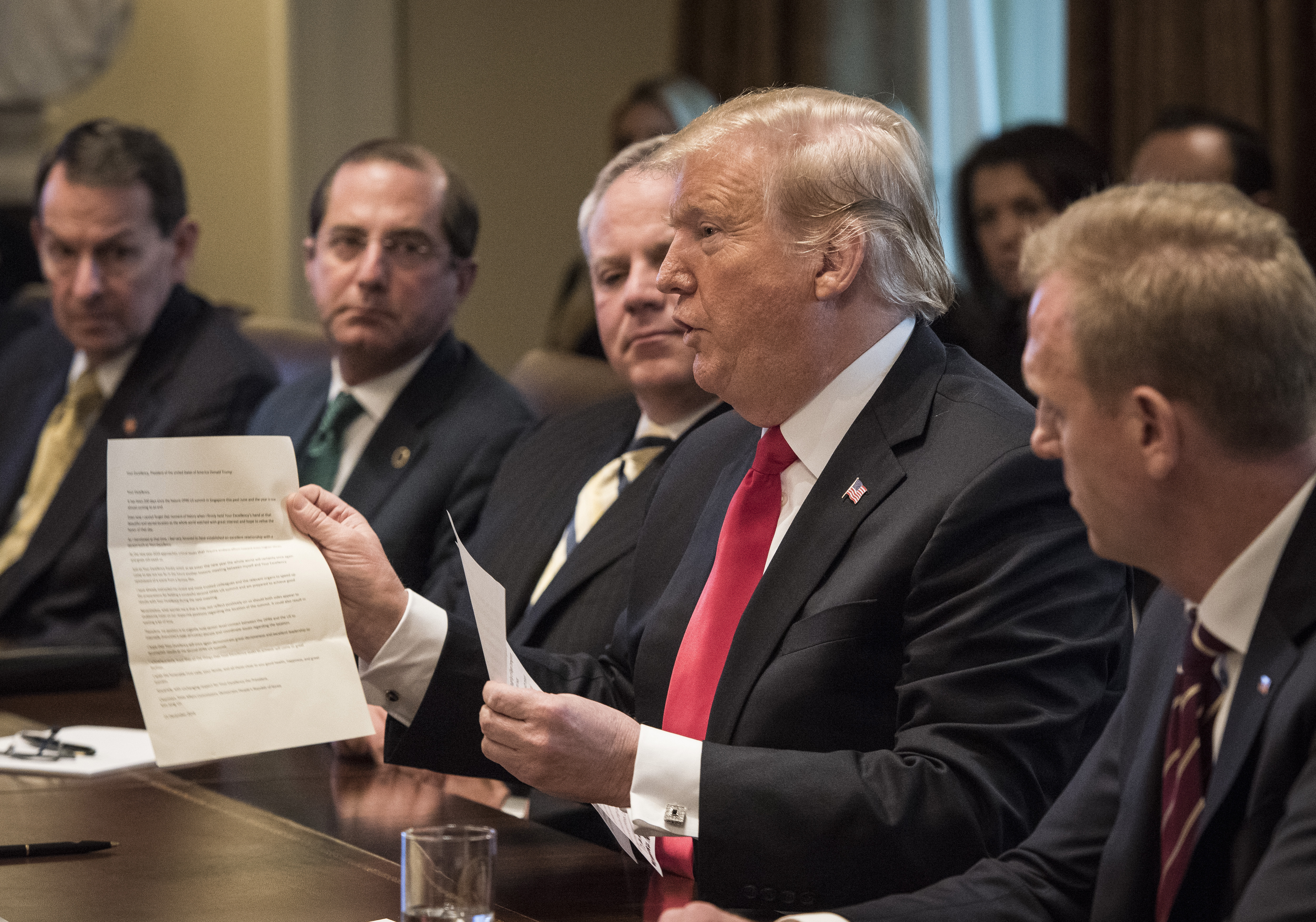 El presidente Donald Trump muestra una carta que supuestamente le fue enviada por el líder norcoreano Kim Jong Un y la cual describió como una “carta de amor”. FOTO: Washington Post por Bill O'Leary.