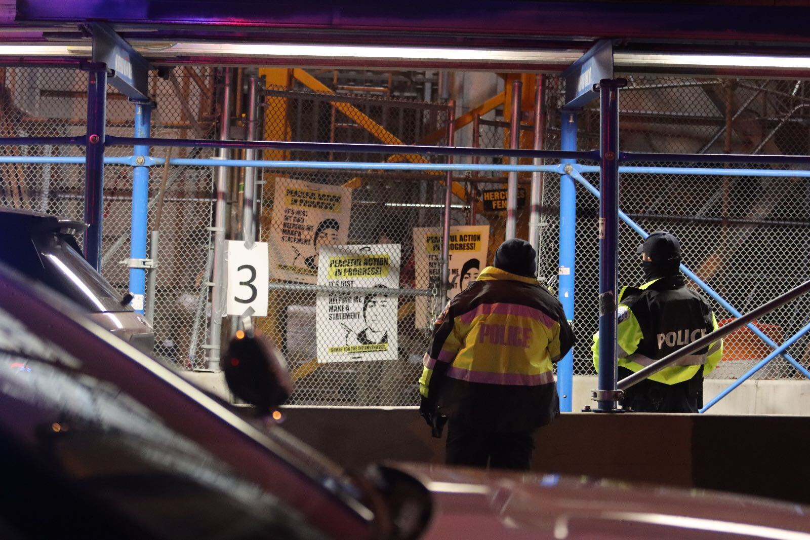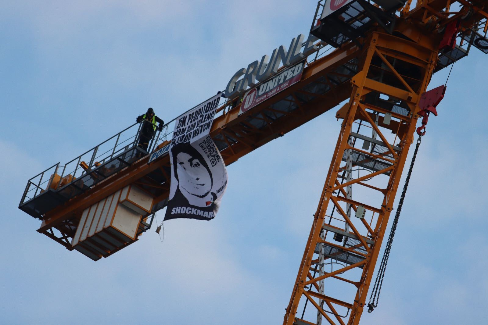 En la parte baja de la grúa, se observó un cártel con una imagen alusiva a Joaquin “Guac” Oliver. En el texto que la acompaña se lee que 45 mil personas han muerto por armas de fuego desde que Joe Biden es presidente, además del link de una página web que lleva el recuento.