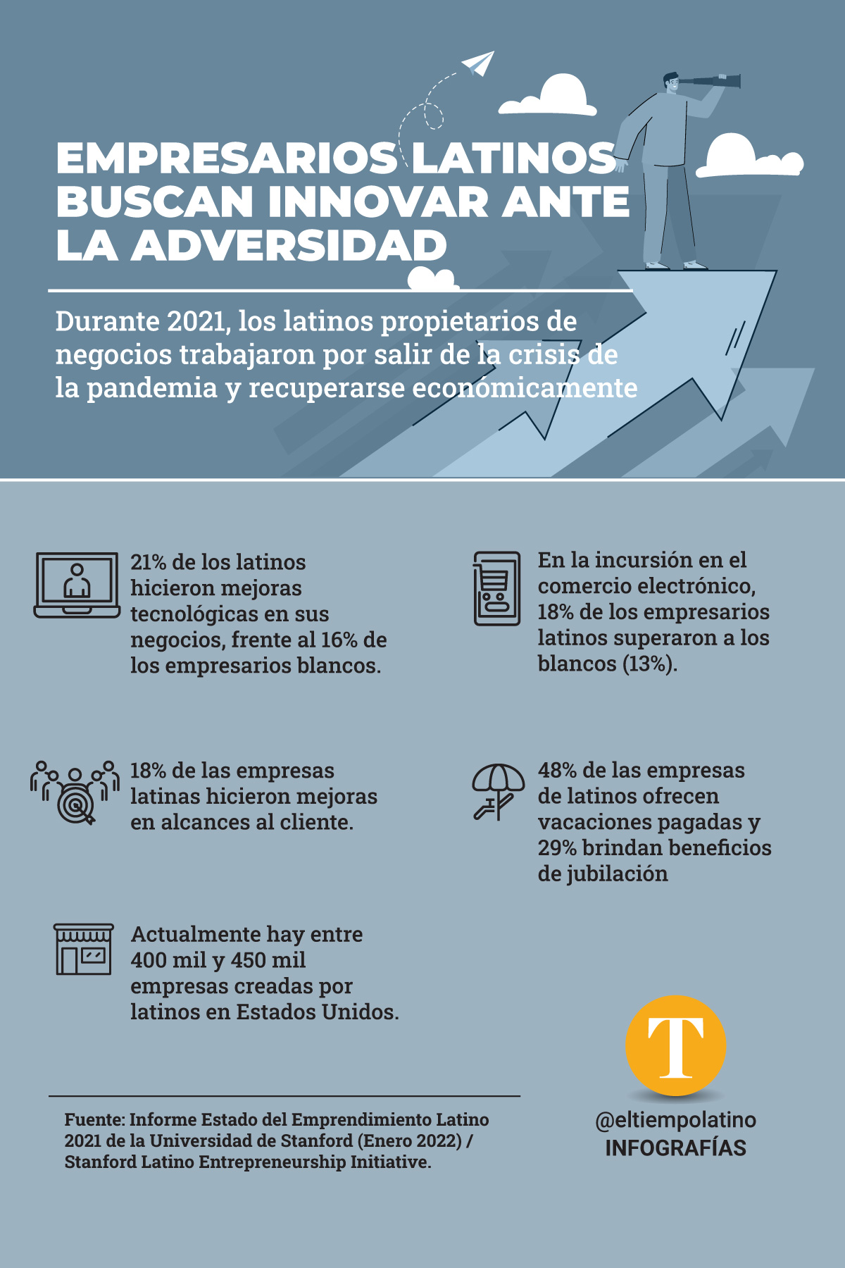 21% de los empresarios latinos reportaron haber hecho mejoras tecnológicas en sus negocios y 18% entraron al comercio electrónico, según el informe Estado del Emprendimiento Latino 2021 de la Universidad de Stanford.