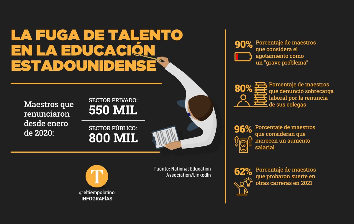 Según datos de la Asociación Nacional de Educación (NEA, por su sigla en inglés), Estados Unidos padece la baja de más de 800 mil maestros en el sector público y más de 550 mil en el privado.