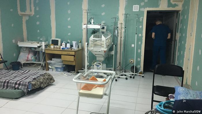 Una sala de urgencias improvisada se encuentra en un largo pasillo y tiene todo lo necesario, incluida una incubadora para bebés con problemas de salud. No importa que haya yeso por toda la pared o un colchón en el suelo.