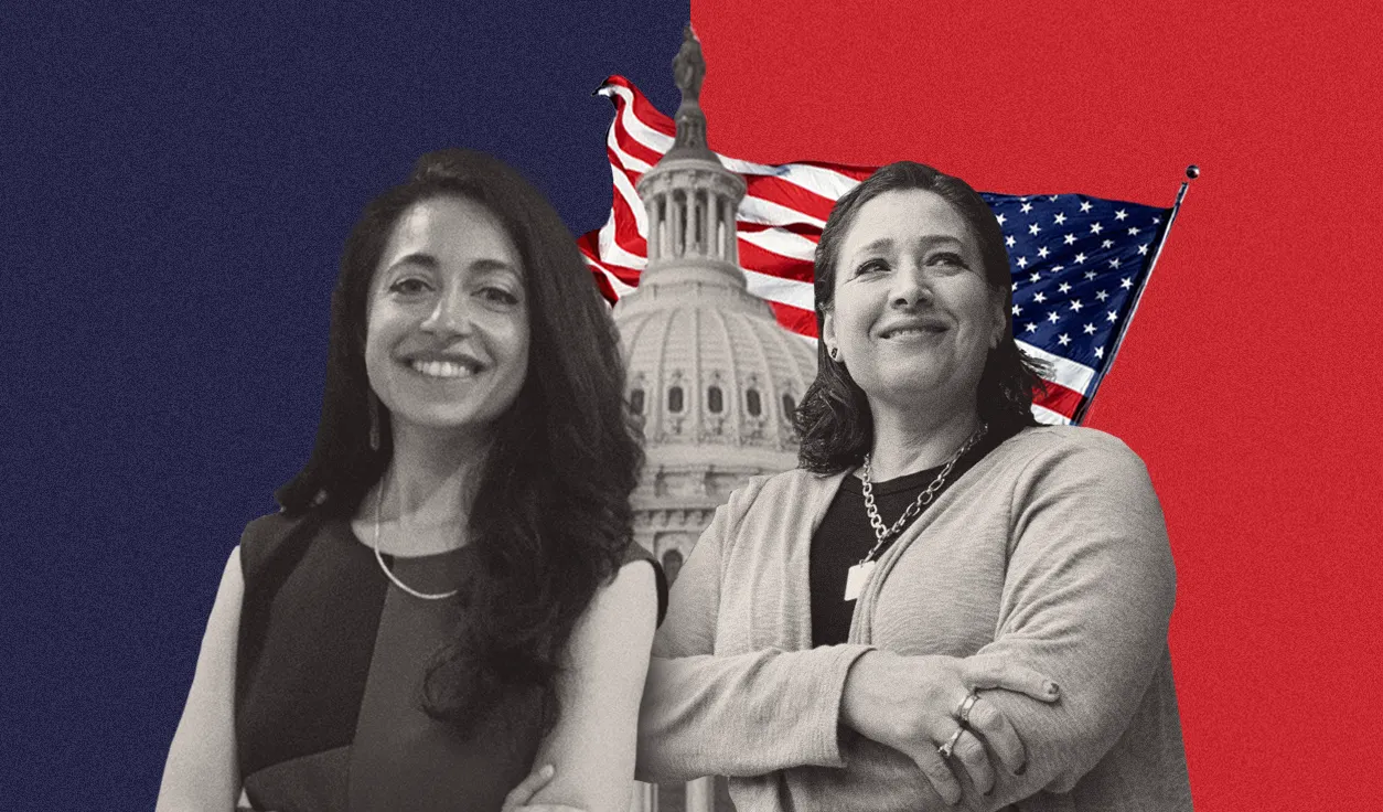 CANDIDATAS. La demócrata Victoria Virasingh, de madre ecuatoriana y padre de la India (izq.), y la republicana Mónica Carpio, de padres peruanos, se lanzan por primera vez como candidatas al Congreso. | Foto: Milagros Meléndez / Ilustración de ETL.