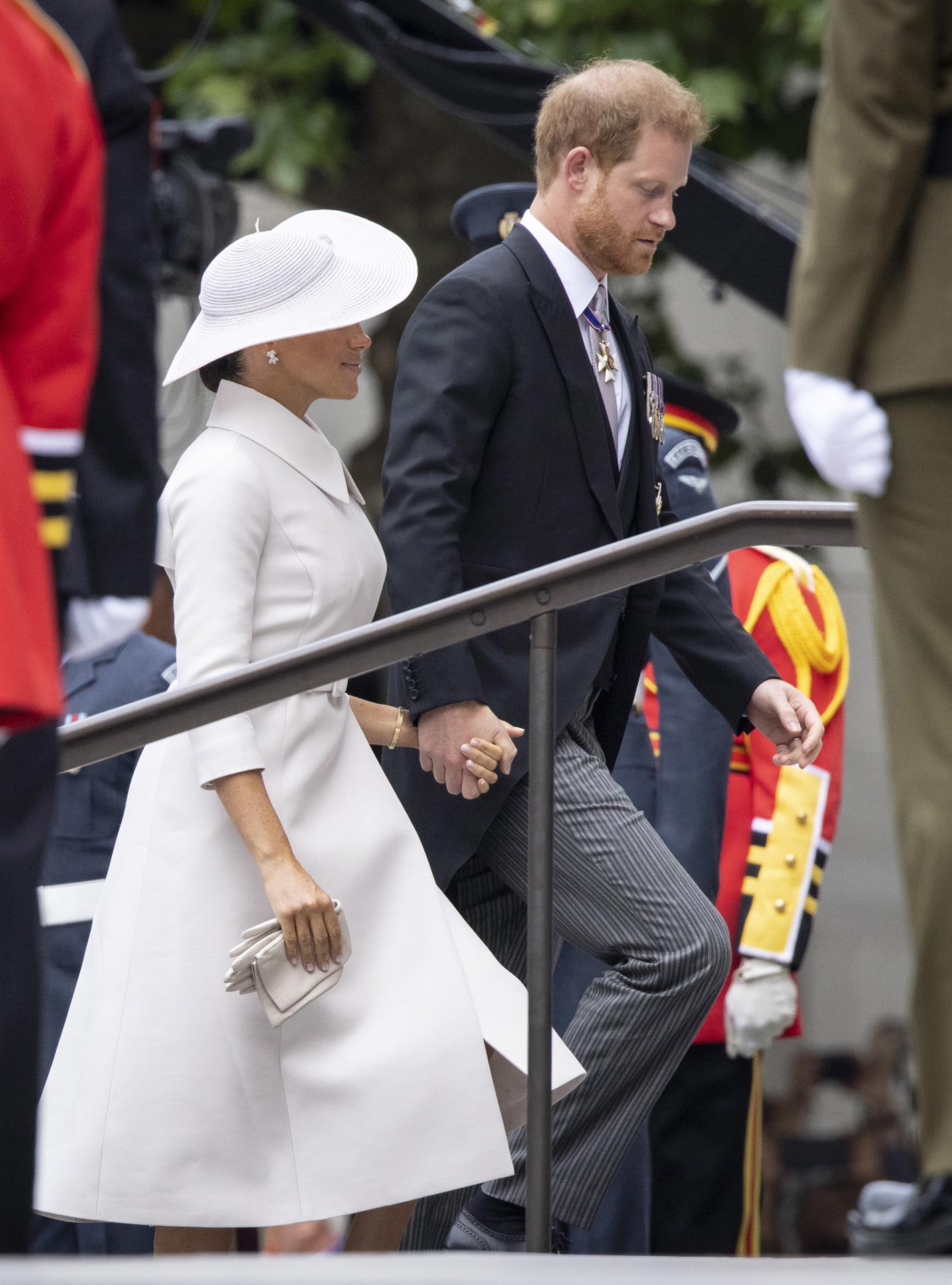 Harry y Meghan se unieron a la Familia Real en Londres para un servicio de acción de gracias en la Catedral de San Pablo en conmemoración del 70 aniversario de la Reina Isabel II. Los duques no han tenido papel protagónico, sino secundario, ya que no fueron vistos en los carruajes reales, de donde sí se trasportaron los miembros activos de la casa real.