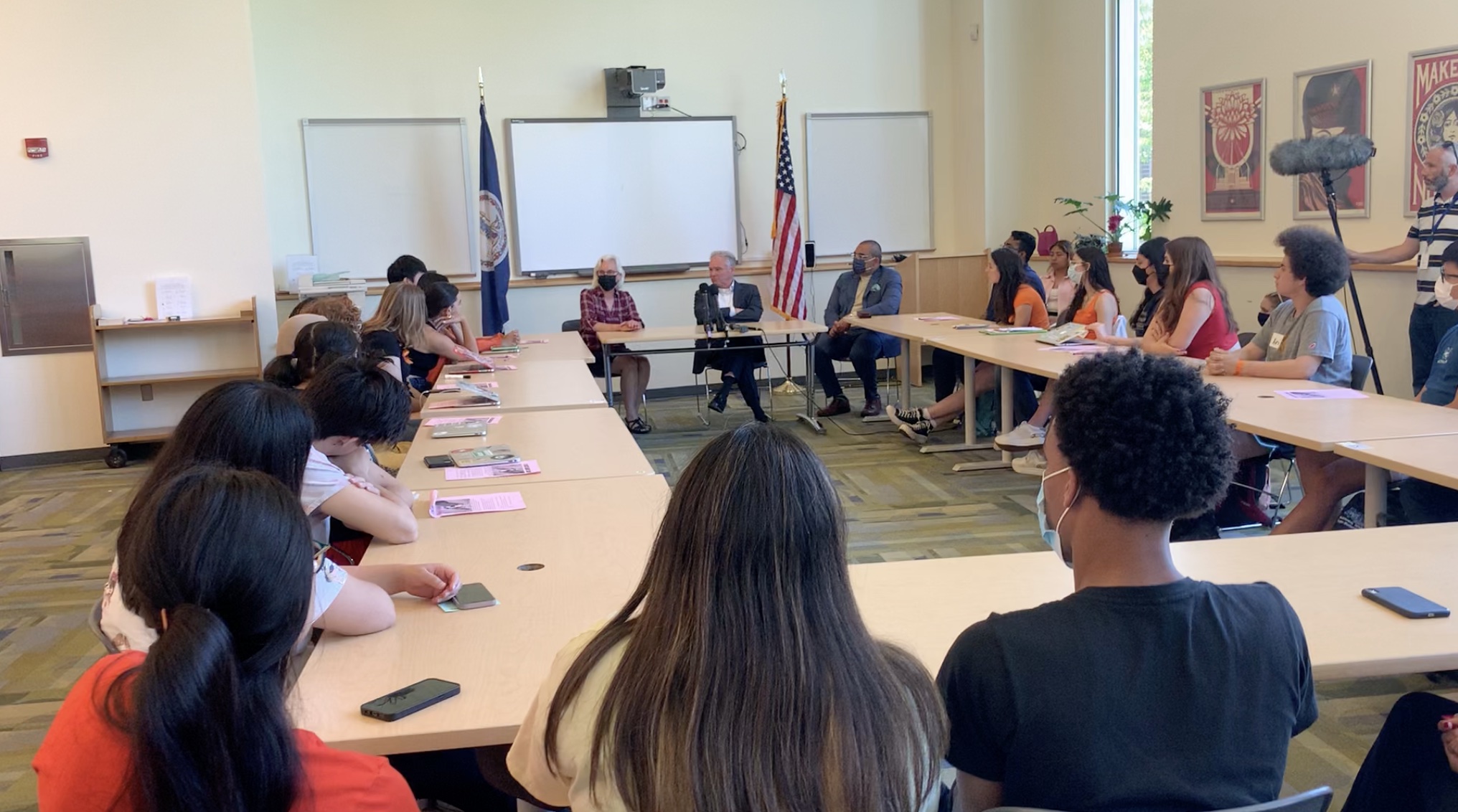 El senador Tim Kaine (D-VA) se reunió con 26 estudiantes de onceavo y doceavo grado de la escuela secundaria Wakefield en Virginia, el lunes 6 de junio. Foto: Milagros Meléndez