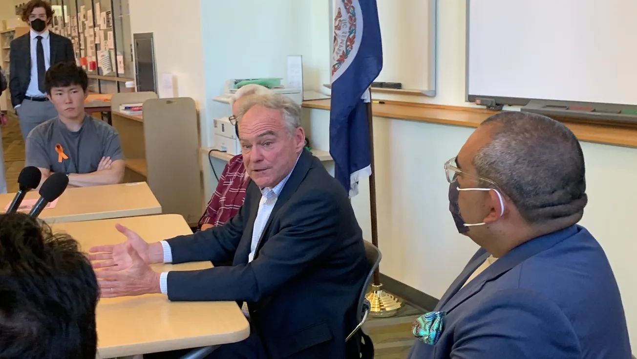 Tim Kaine dice a estudiantes de Arlington que hay esperanzas para un plan de control de armas en el Congreso