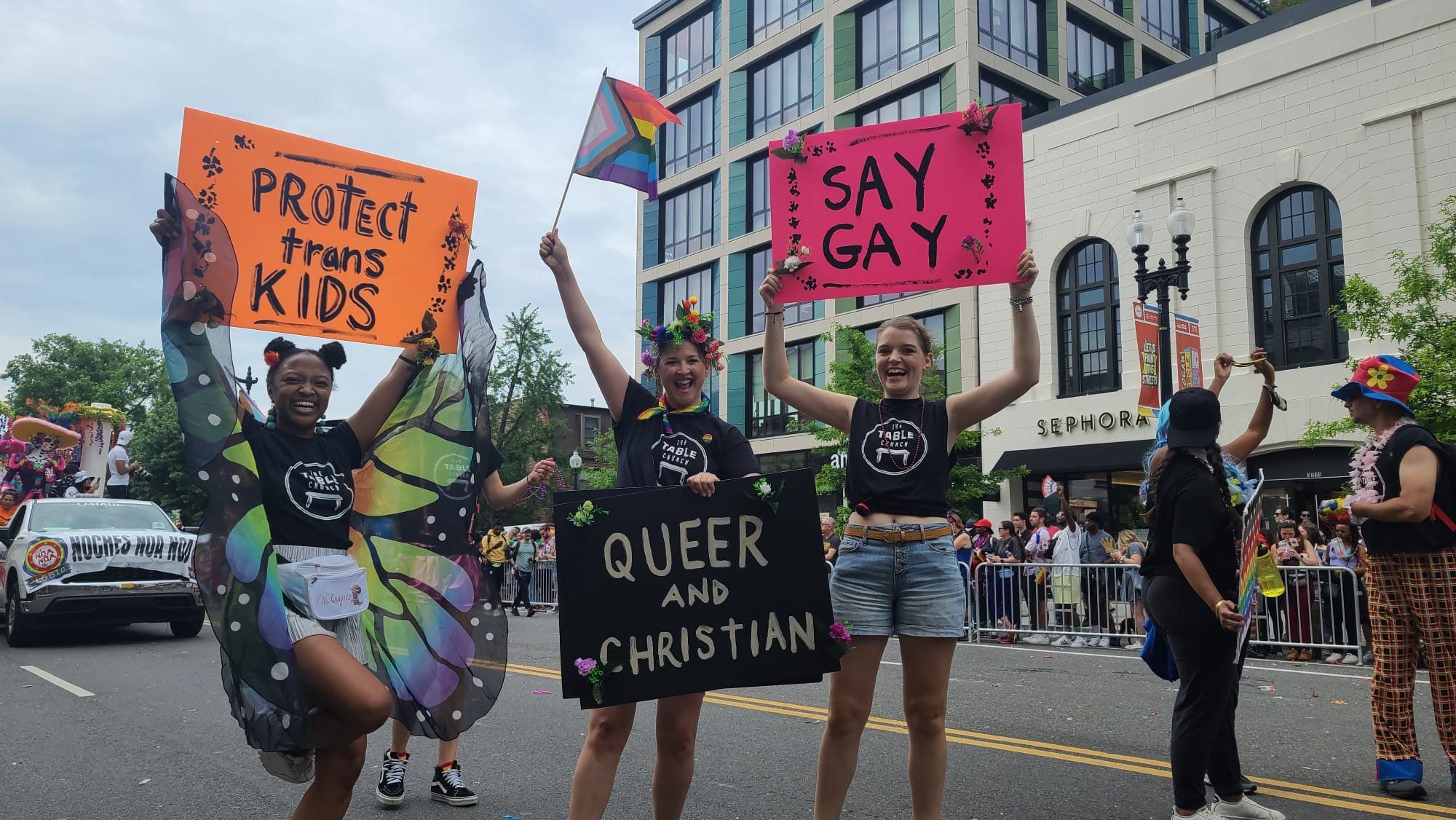 Pancartas con "Protejan a los niños trans" o "Di gay" fueron parte de las celebraciones. Ambas hacen alusiones a distintas legislaciones que se han llevado a cabo en los últimos meses.
