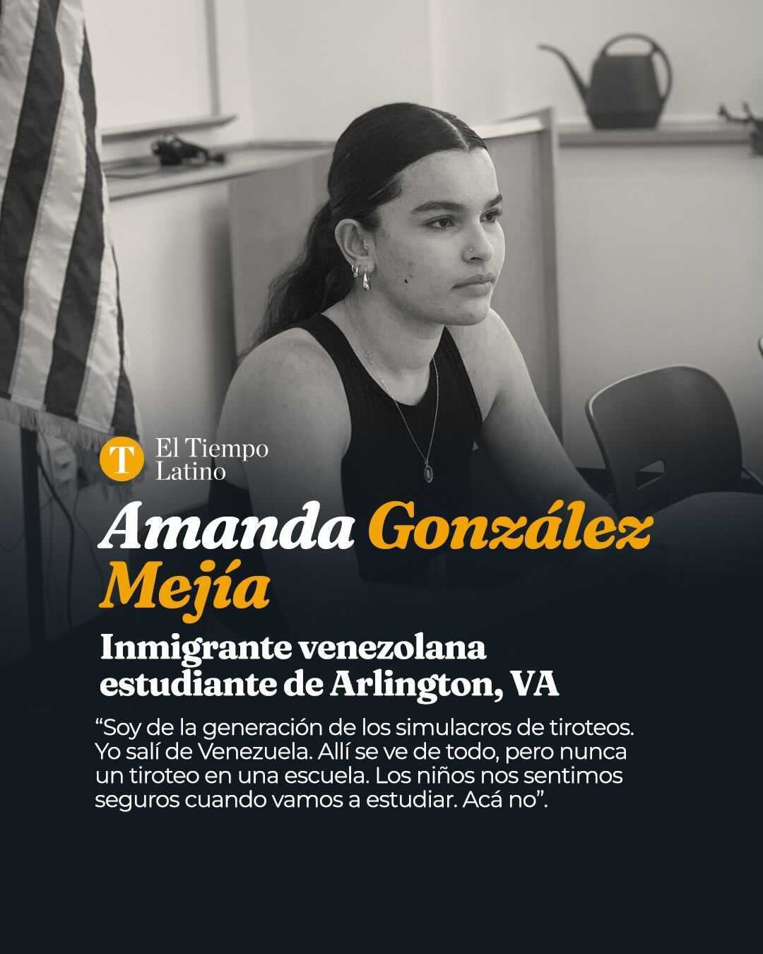Amanda González Mejía recién había emigrado de Venezuela y tenía 9 años, cuando escuchó en el salón de clases un anuncio por el parlante y todos sus compañeros se levantaron y bajaron la voz. Cargaron las mesas hacia la puerta bloqueándola y colocaron sillas encima, a la vez que la maestra rápidamente tapó la ventana, apagó las luces y bajó las persianas.