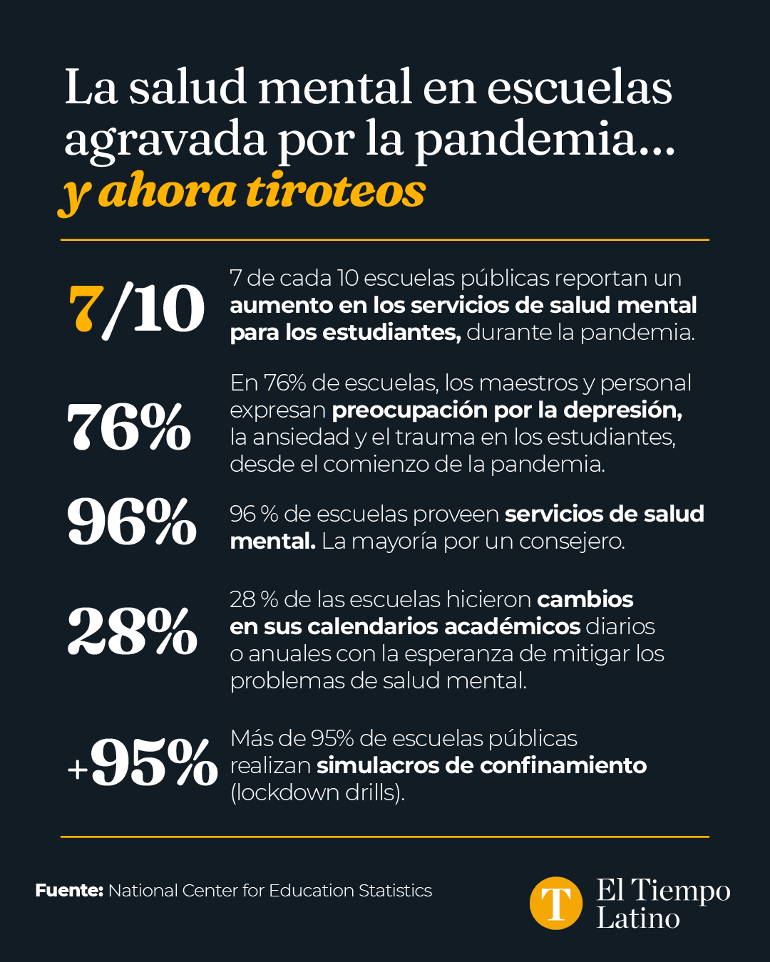 Una encuesta elaborada por National Center for Education Statistics señala que 7 de 10 escuelas han experimentado este aumento.