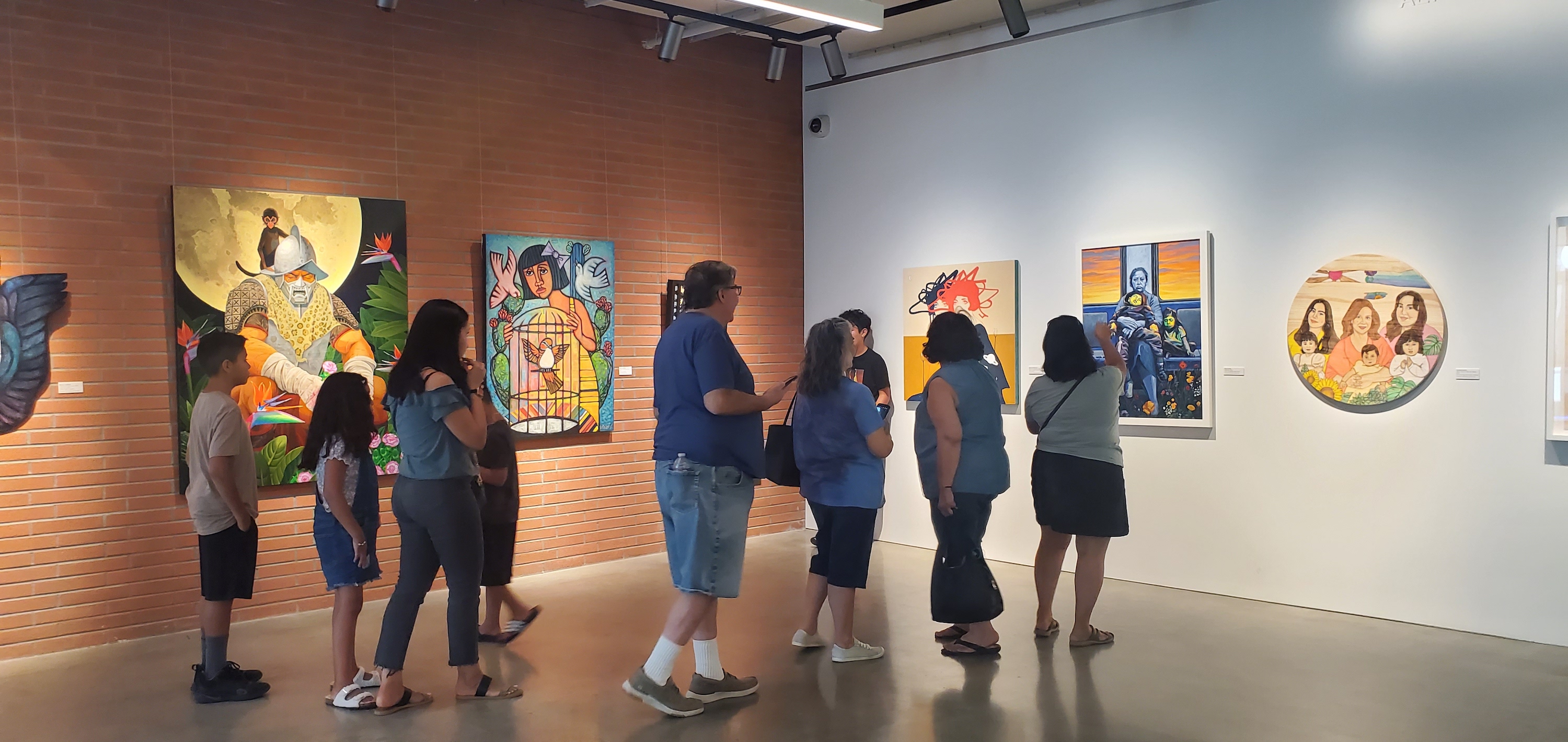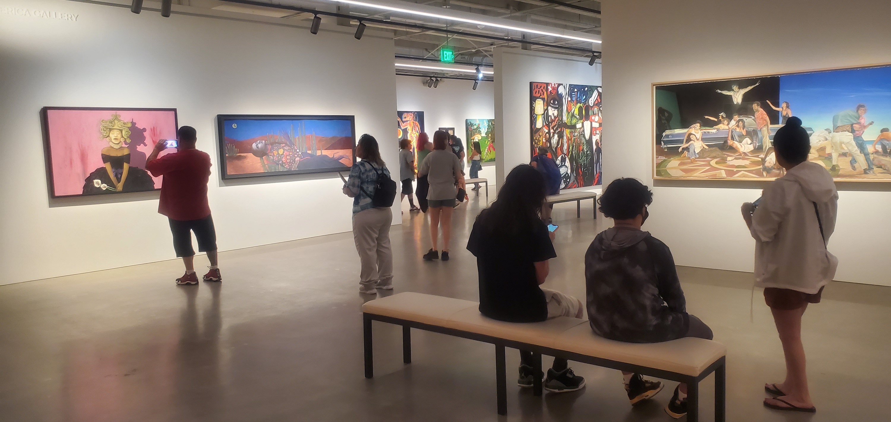 En un candente miércoles de verano por la tarde -temperatura de mediodía en Riverside, California, 101 grados- el “Cheech” estaba repleto de familias, en su mayoría latinas, paseando por sus amplios salones, que miraban y también comentaban las pinturas de la exhibición.