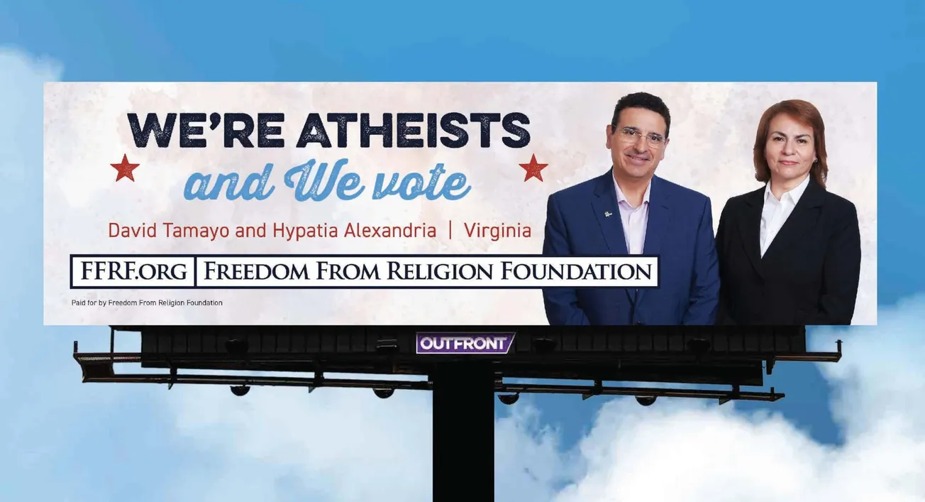 La valla publicitaria de 14x48 pies en la que aparece una pareja de Virginia proclamando con orgullo "Somos ateos y votamos" acaba de ser lanzada por la Freedom From Religion Foundation en este año electoral crítico.