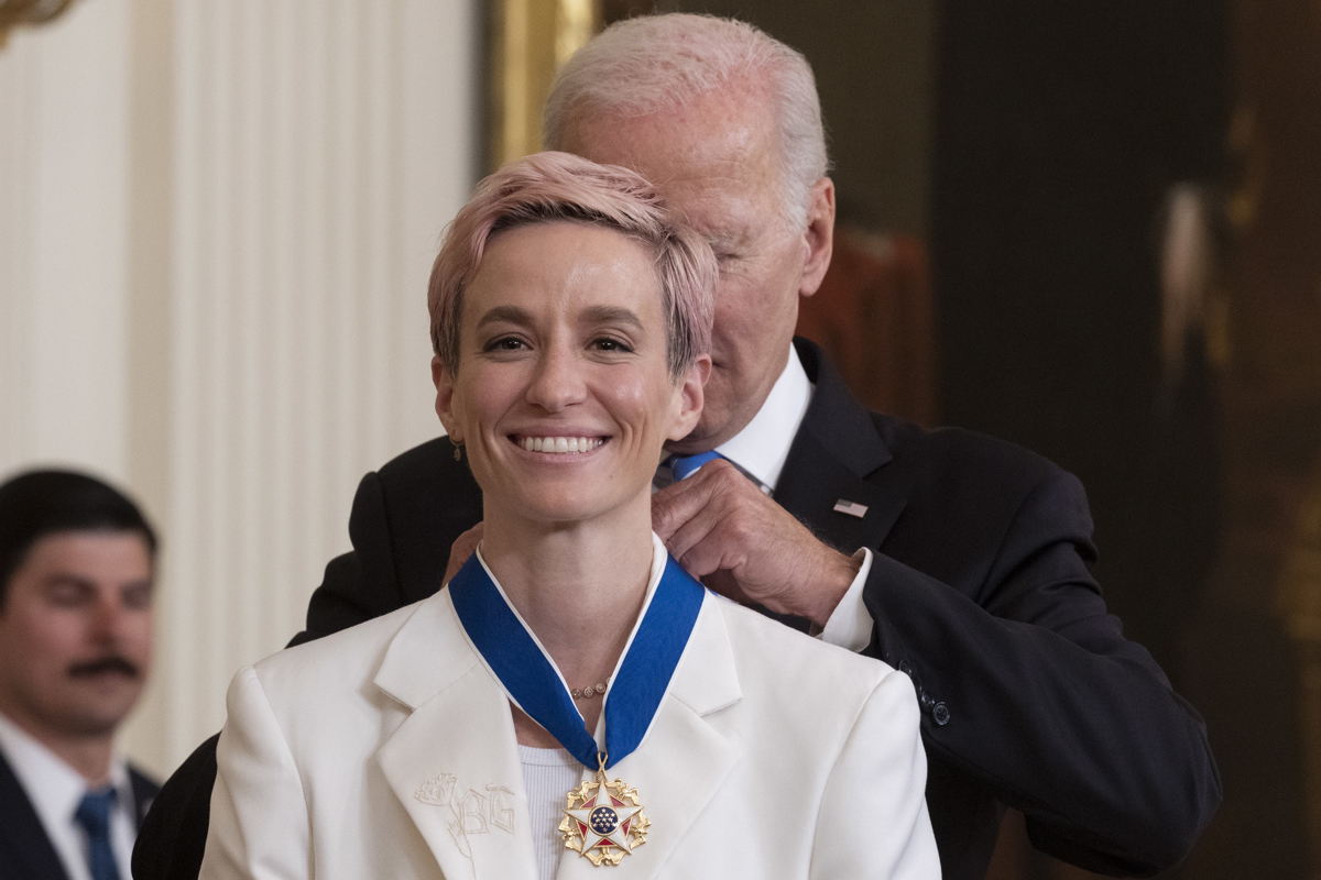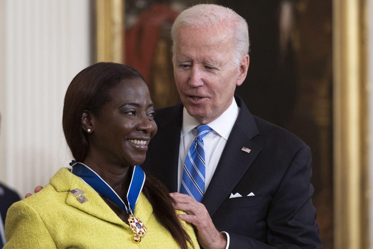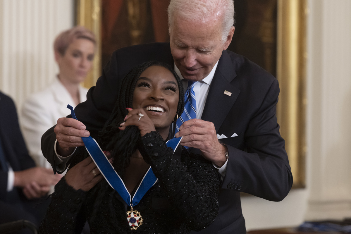 El presidente Joe Biden concedió este jueve la Medalla Presidencial de la Libertad a 17 estadounidenses, entre ellos la gimnasta olímpica; Simone Biles; la excongresista, Gabrielle Giffords; la estrella del fútbol femenino, Megan Rapinoe; a la profesora universitaria e hispana Juliet V. García, presidenta por muchos años de la Universidad de Texas en Brownsville; y al padre de la estrella de oro Khizr Khan.