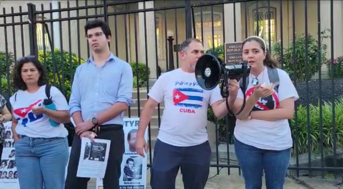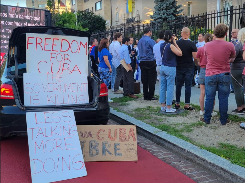 Un grupo de cubanos se concentró el lunes frente a la embajada de Cuba en DC para recordar las manifestaciones del 11 de julio de 2021, en contra del régimen castrista, que iniciaron debido a la escasez de alimentos y medicinas, así como la falta de respuesta de Miguel Díaz-Canel a la pandemia del COVID-19.