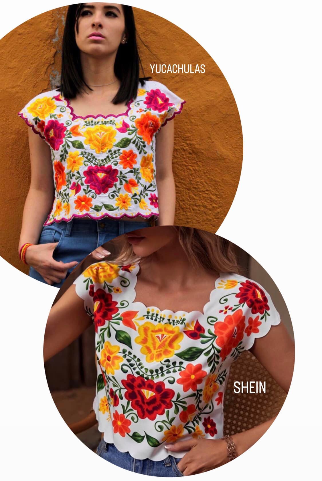 La blusa que Shein lanzó al mercado copia el corte de la diseñada por las artesanas mexicanas, también la forma, el color y la posición de las flores amarillas, rojas y fucsias que en vez de estar bordadas, como en el diseño original, fueron estampadas.
