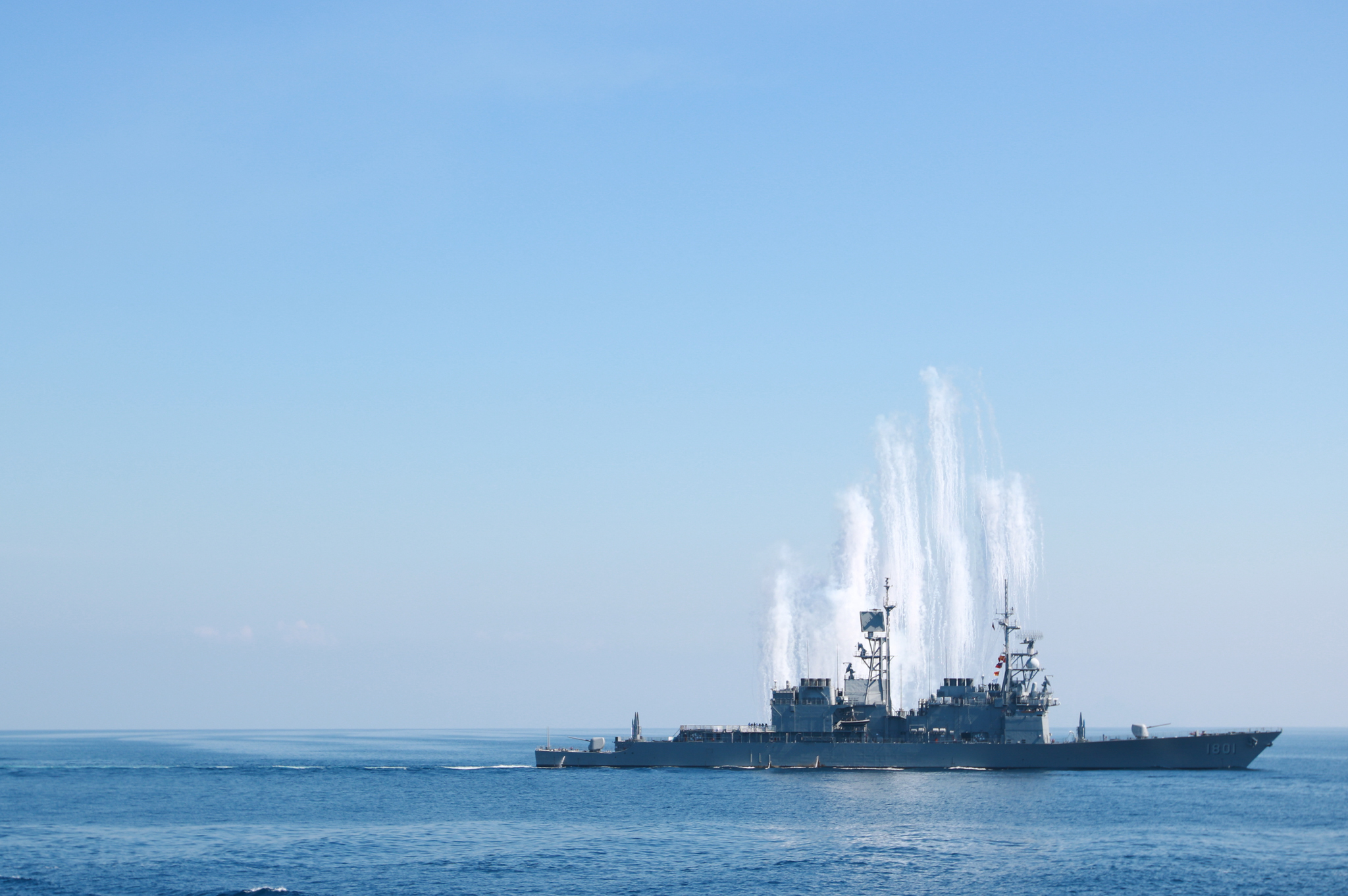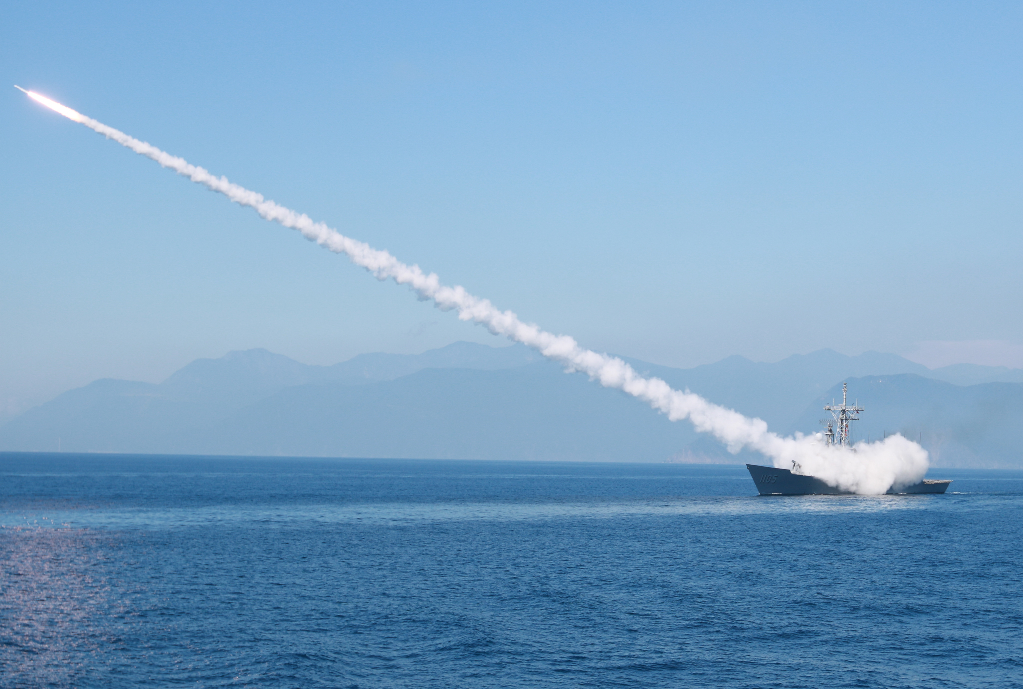 El martes, en los mares de las afueras del puerto naval de Suao, un misil lanzado desde una fragata de la armada dejó una estela de humo en el cielo mientras las cargas de profundidad lanzaban rocío. Los cazas F-16 pasaban por encima mientras los destructores de misiles guiados disparaban sus cañones.