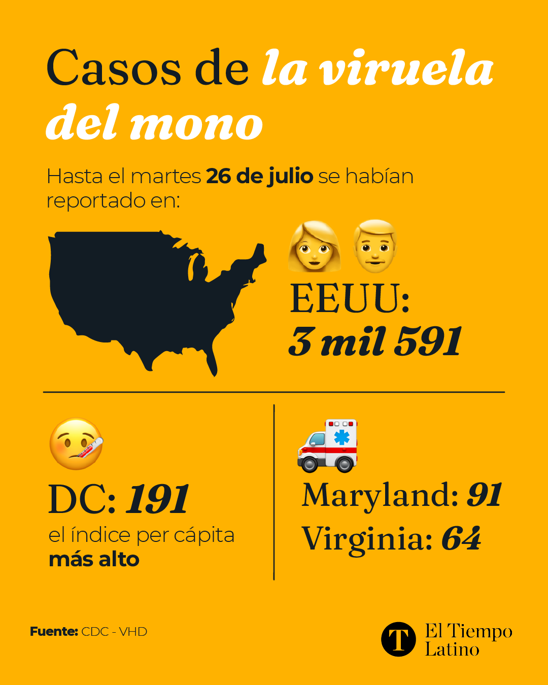 El Distrito de Columbia tiene la mayor cantidad de casos de viruela del simio per cápita en comparación con todos los estados. Hasta el 26 de julio, la capital de la nación, que cuenta con una población de 670 mil habitantes, había reportado 191 casos de la infección.