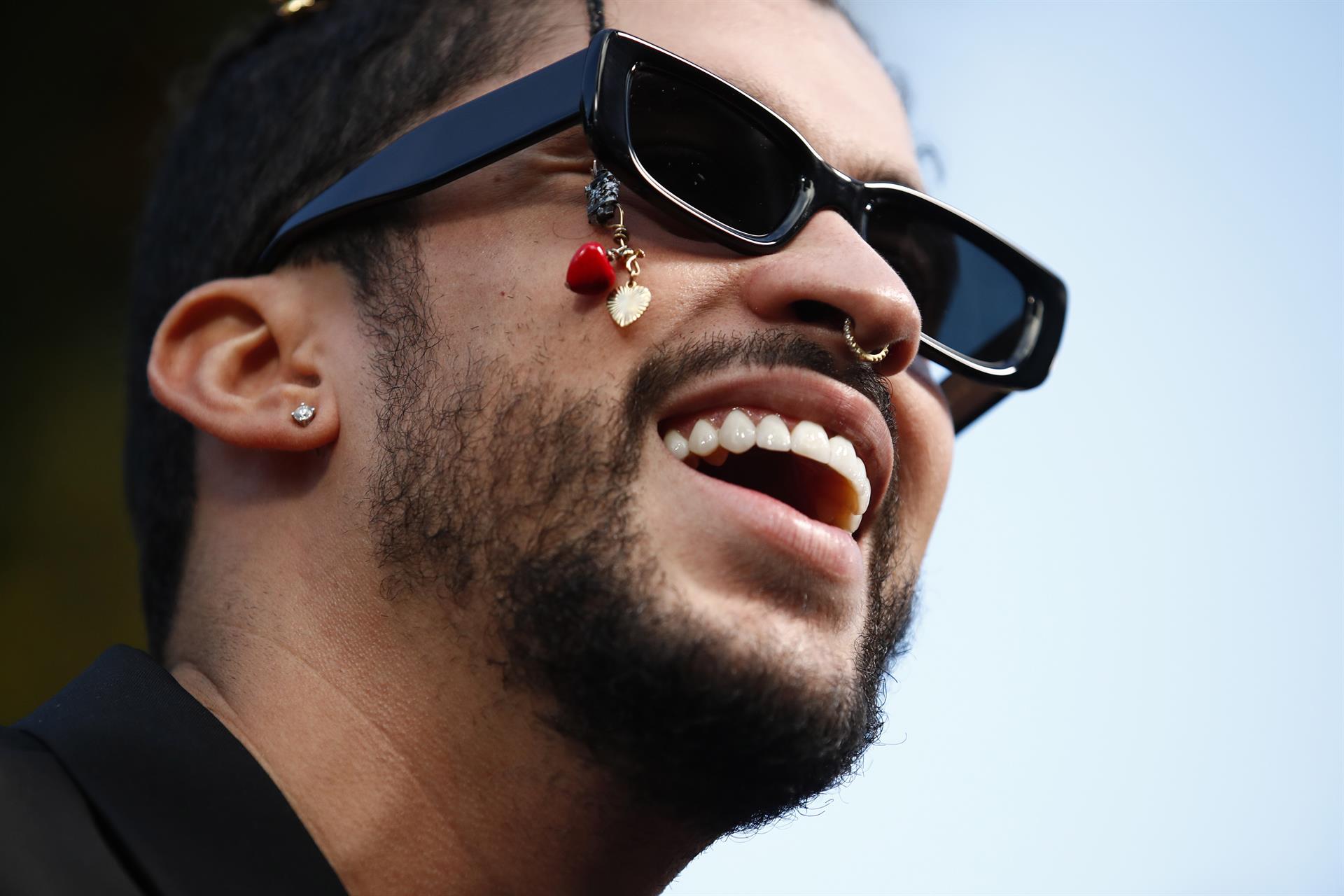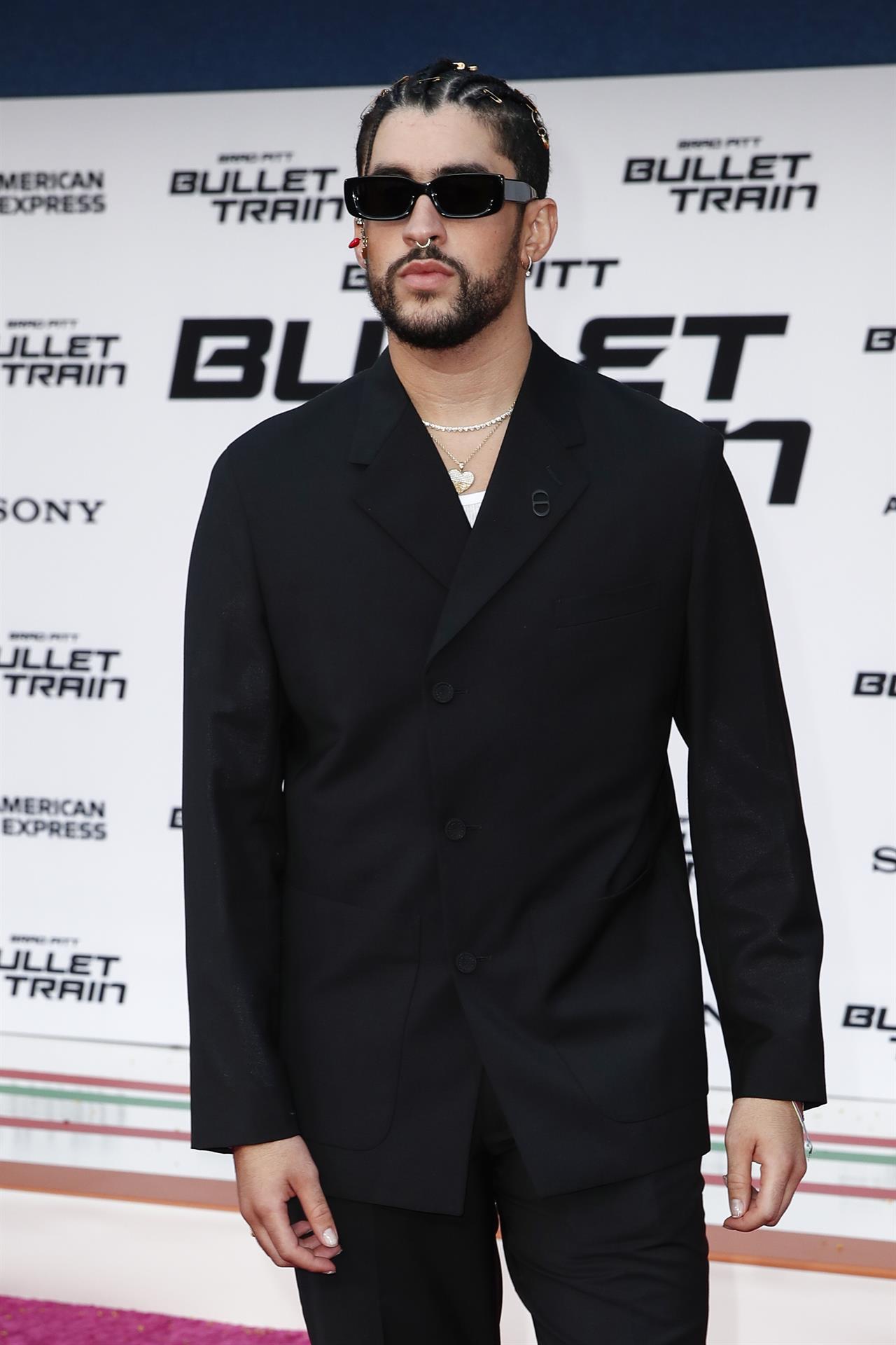 Bad Bunny optó por un traje negro, con zapatos y gafas a juego y un peinado de trenzas.