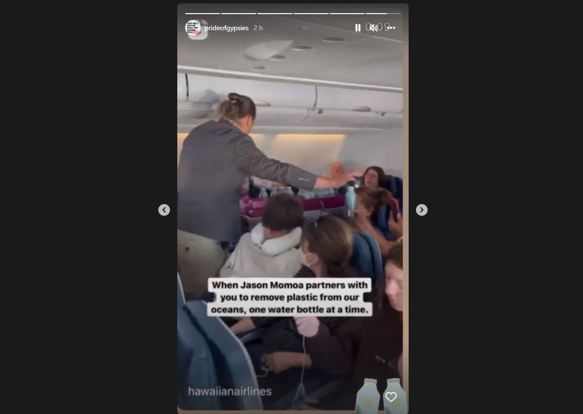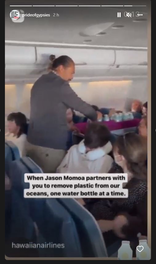 El video en redes sociales se hizo viral cuando los pasajeros notaron quien estaba entregando personalmente las botellas de aluminio era Jason Momoa.