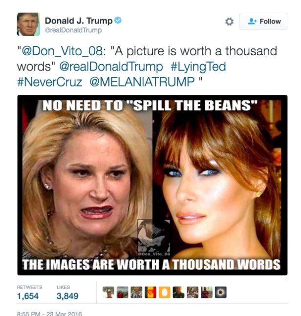 Un duelo en el que esposas fueron afectadas. Entre los dimes y diretes de ambos candidatos, Trump insinuó que la esposa de Ted Cruz no era físicamente atractiva al compararla con Melania, por lo que su rival político respondió tildándolo de "cobarde llorón".
