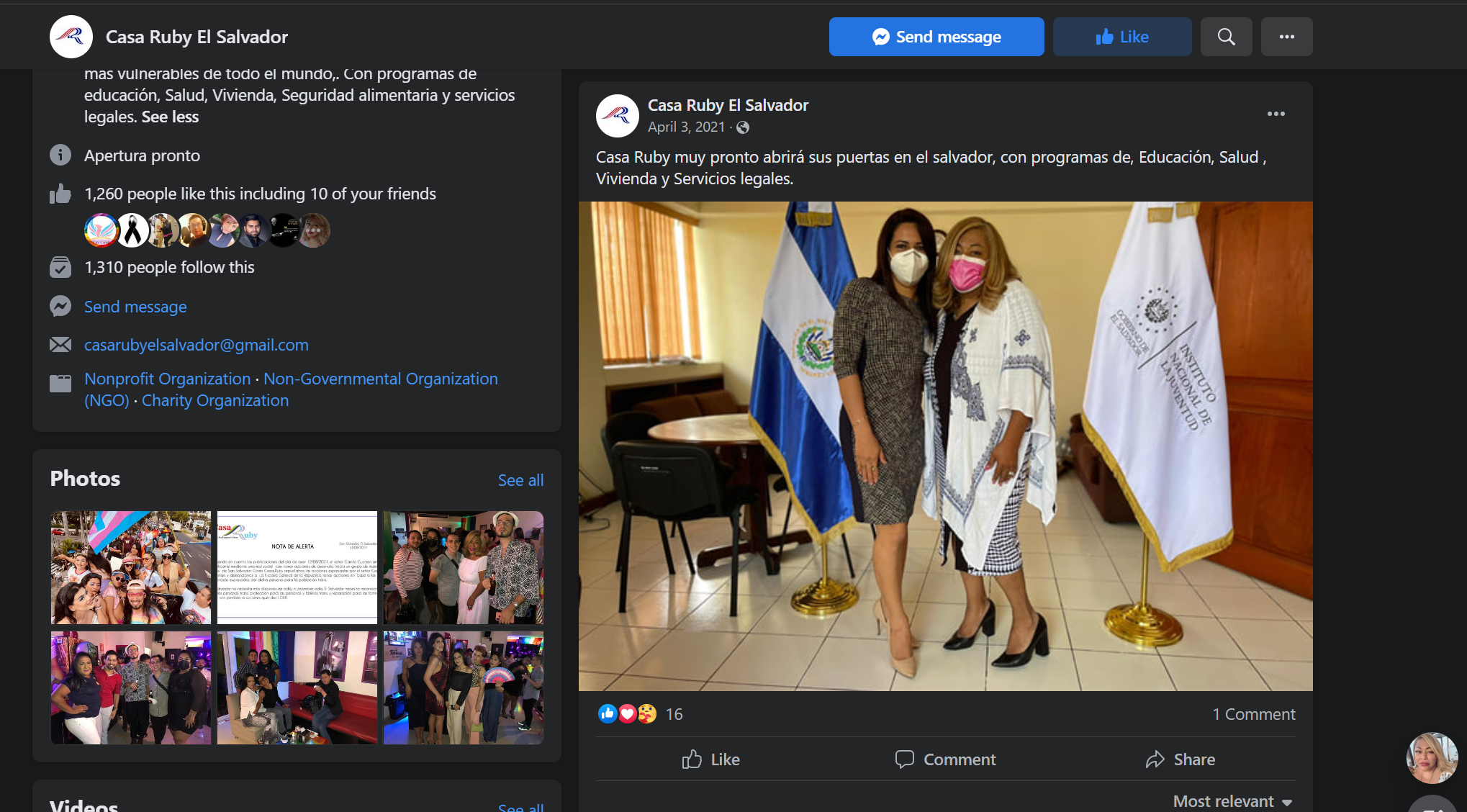 De hecho, el 3 de abril del año pasado, ella apareció en una fotografía, publicada en el muro de Facebook de Casa Ruby El Salvador con Brenda Oriana Rosales Navarro, subdirectora de la Dirección de Género y Diversidad del Ministerio de Cultura y del Instituto Nacional de la Juventud (INJUVE), entidad del gobierno salvadoreño, anunciando que pronto lanzarían programas de “educación, vivienda, salud y servicios legales”.