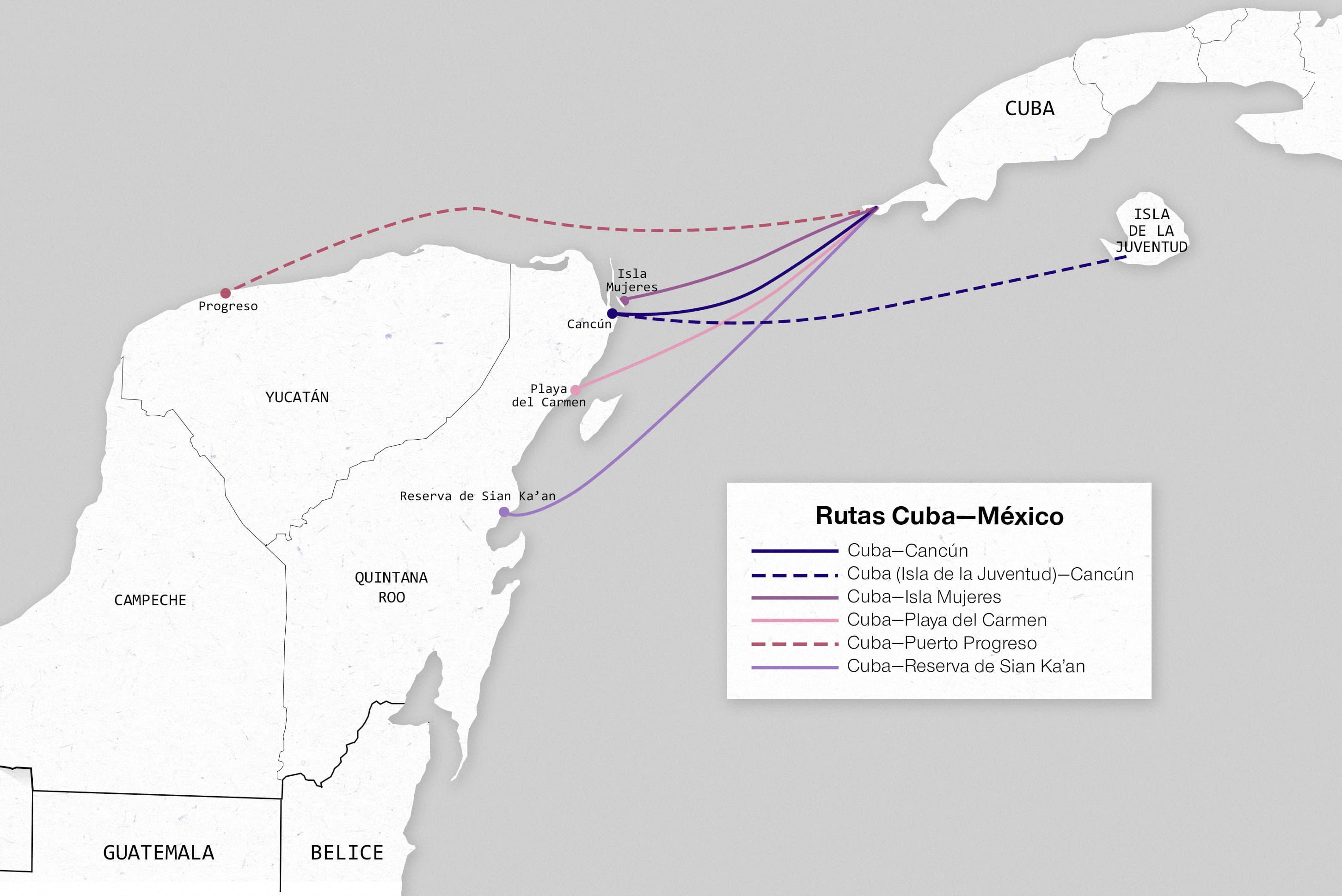 El estudio “Mar adentro: migrantes y náufragos en el mar”, publicado en diciembre de 2021 por la Organización Internacional para las Migraciones (OIM), identificó por lo menos seis rutas migratorias de Cuba a los estados de Quintana Roo y Yucatán, en el sureste de México, a partir de entrevistas con informantes clave e información de las dependencias públicas. Cancún, Isla Mujeres y Playa del Carmen son las rutas más transitadas, pero también se identificó una hacia la Reserva de la Biósfera de Sian Ka’an, a la altura de Boca Paila, una zona de difícil acceso y con nula vigilancia de las autoridades mexicanas.