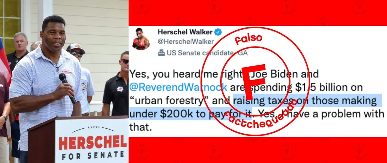 El candidato republicano a senador de Georgia, Herschel Walker, durante un evento de campaña en agosto, criticó la Ley de Reducción de la Inflación promulgada por el presidente Joe Biden, afirmando: “mucho dinero va hacia árboles. ¿No tenemos suficientes árboles aquí?”. Al día siguiente escribió en un tweet dirigido a su contrincante, el senador demócrata Raphael Warnock: “Sí, me escuchaste bien… Joe Biden y @ReverendWarnock están gastando $1.5 mil millones en "reforestación urbana" y aumentando los impuestos a quienes ganan menos de $200 mil para pagarla. Sí, tengo un problema con eso.”