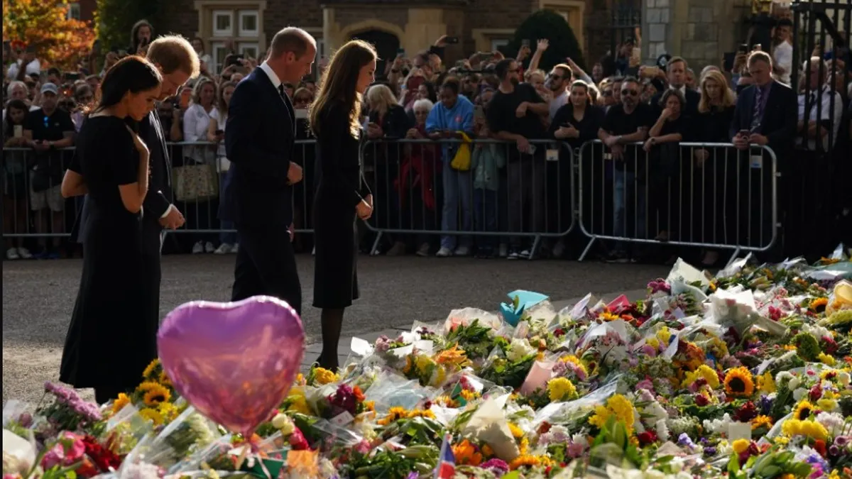 Los nuevos príncipes de Gales, William y Kathleen así como los duques de Sussex, Harry y Meghan, estaban vestidos de negro en representación del luto por la muerte de la reina. En el sitio observaron los presentes que dejaron las personas en el castillo de Windsor, luego se acercaron a los presentes e intercambiaron algunas palabras con ellos.