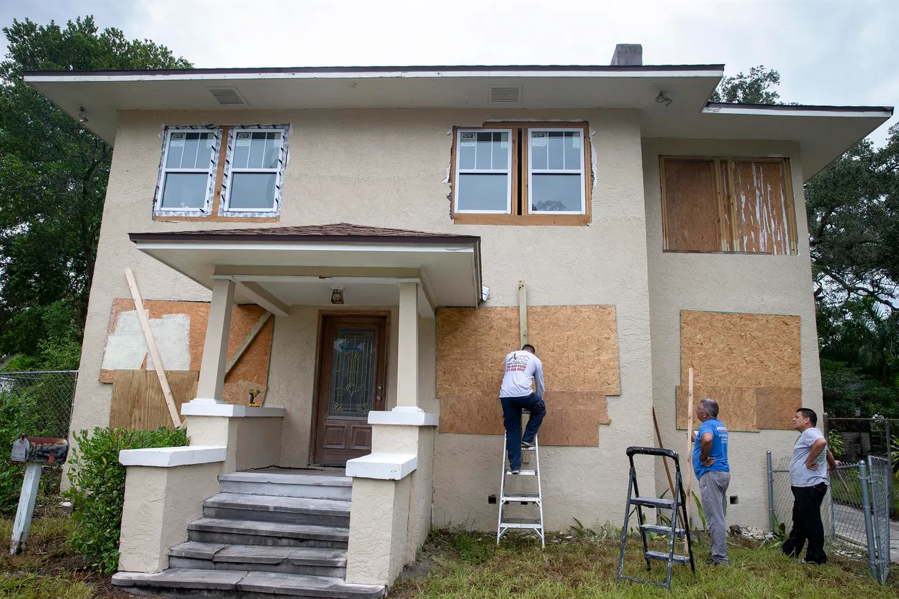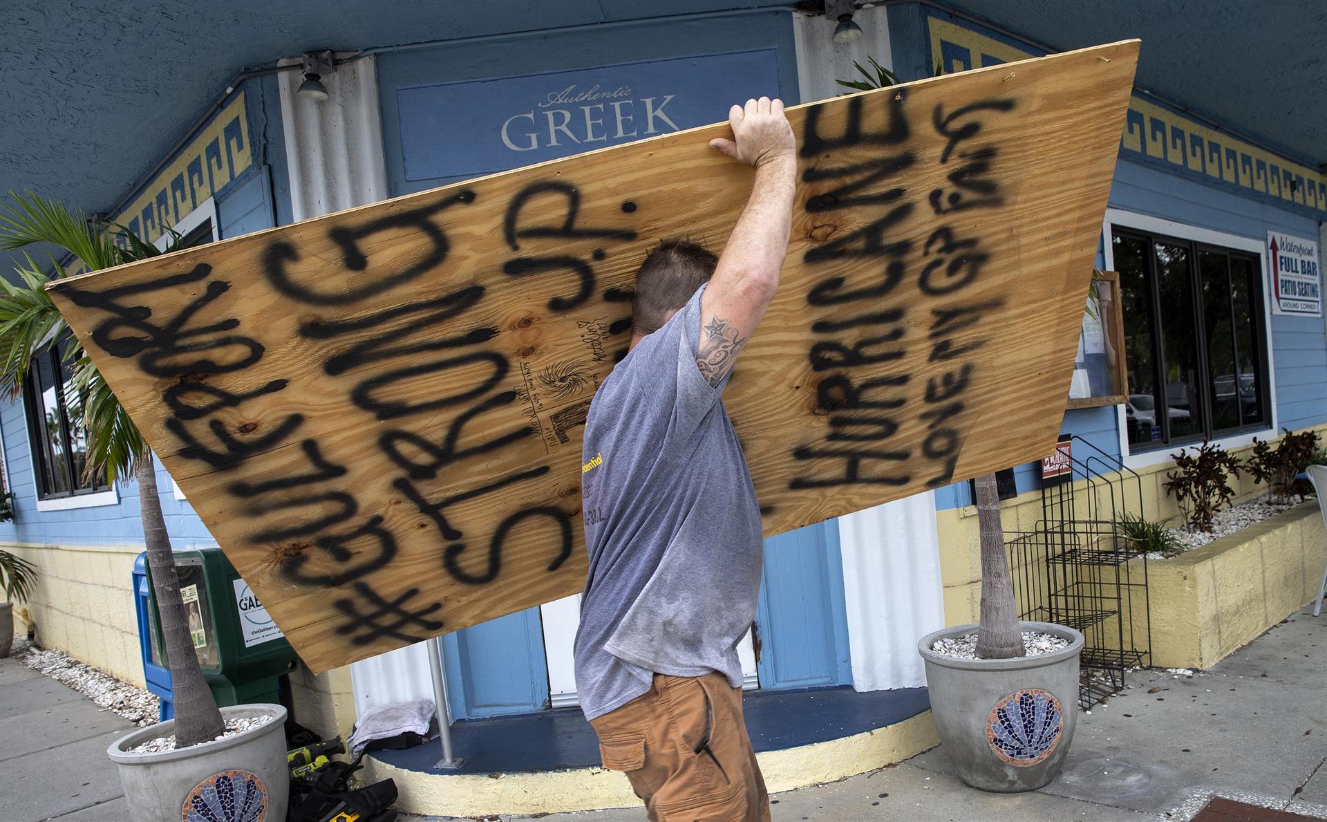 Los residentes de Gulfport Beach colocan madera contrachapada mientras se preparan para el huracán Ian en Gulfport, Florida, EE.UU., el 27 de septiembre de 2022. FOTO EFE/EPA/CRISTÓBAL HERRERA-ULASHKEVICH