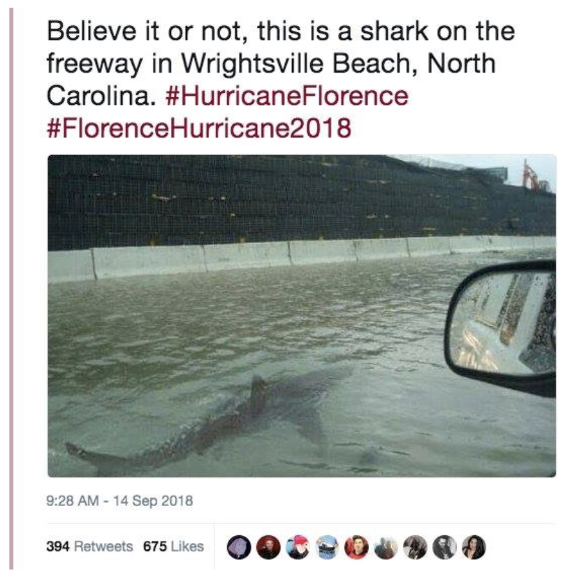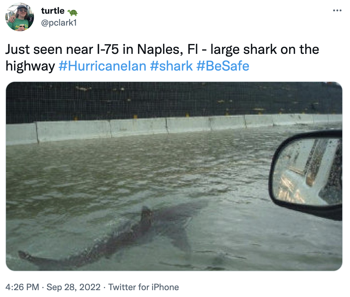 Una de las cuentas que compartieron la imagen falsa indicaron que habían visto al tiburón en la I-75, en Naples, Florida. El usuario aseguraba: “Acaba de ser visto, cerca de la I-75 en Naples, Fl, un gran tiburón en la autopista”.