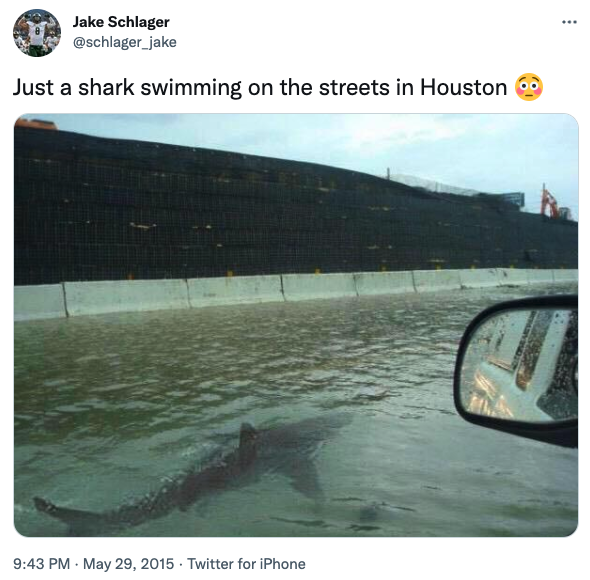 Pero aquí pueden ver al mismo tiburón, en Houston, en 2015, durante el huracán Harvey. El usuario decía entonces que era “solo un tiburón en las calles de Houston”.