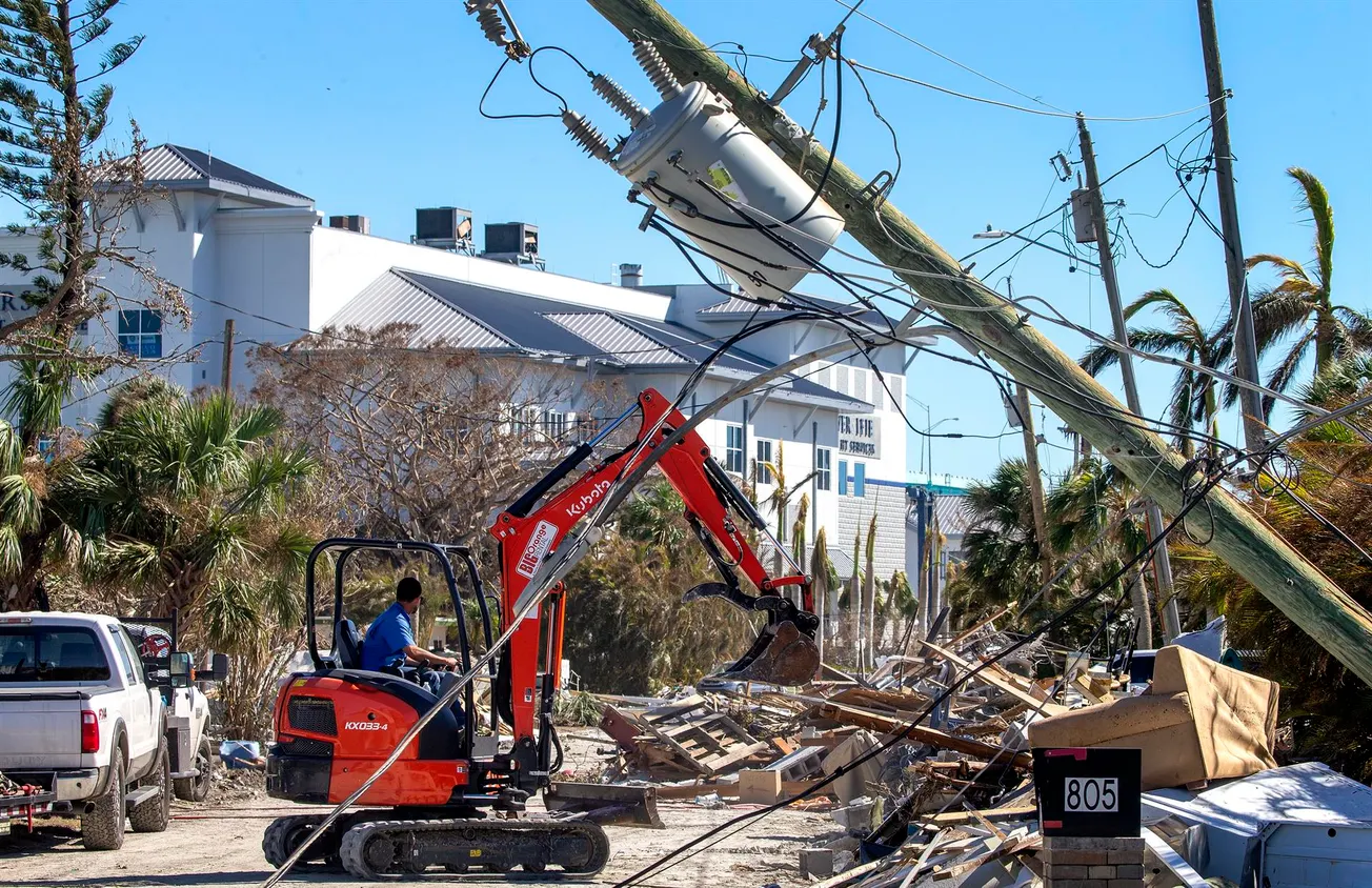 Una excavadora recoge escombros frente a un poste eléctrico caído en la isla de San Carlos tras el paso del huracán Ian en Fort Myers Beach, Florida, EE.UU. el 02 de octubre de 2022 | Foto EFE/EPA/CRISTOBAL HERRERA-ULASHKEVICH