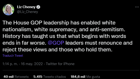 Luego del tiroteo de Buffalo en mayo de este año, Liz Cheney, representante del Partido Republicano de Wyoming y crítica con el expresidente Donald Trump, publicó un tuit en el que señaló a los líderes de su propio partido de “alimentar el nacionalismo, la supremacía blanca y el antisemitismo”. Todas ellas, como precisa el documento del National Immigration Forum, son premisas del discurso de la teoría del Gran Reemplazo.