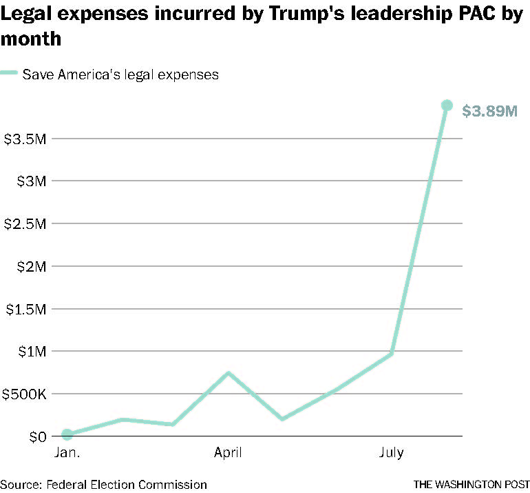El dinero que el PAC de liderazgo repartió entre los abogados casi se triplicó entre mayo y junio cuando las autoridades enviaron citaciones a una amplia variedad de personas involucradas en los esfuerzos para revertir la derrota de Trump en noviembre de 2020. Esa suma casi se duplica en julio con respecto a junio, aproximándose a $1 millón.