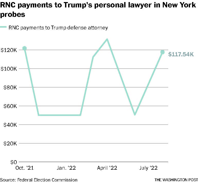 El Comité Nacional Republicano también repartió cientos de miles de dólares para cubrir los gastos legales personales de Trump. El partido explicó el inusual acuerdo, revelado por primera vez por el Washington Post el pasado otoño, al atacar las investigaciones como motivadas políticamente.