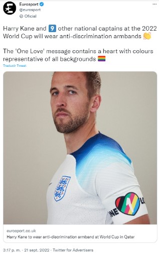 “Harry Kane y otros 9 capitanes nacionales en la Copa Mundial 2022 lucirá una banda en su brazo con un mensaje antidiscriminatorio. El mensaje de ‘Un amor’ contiene un corazón con los colores LGTBIQ+”, dice este tuit: