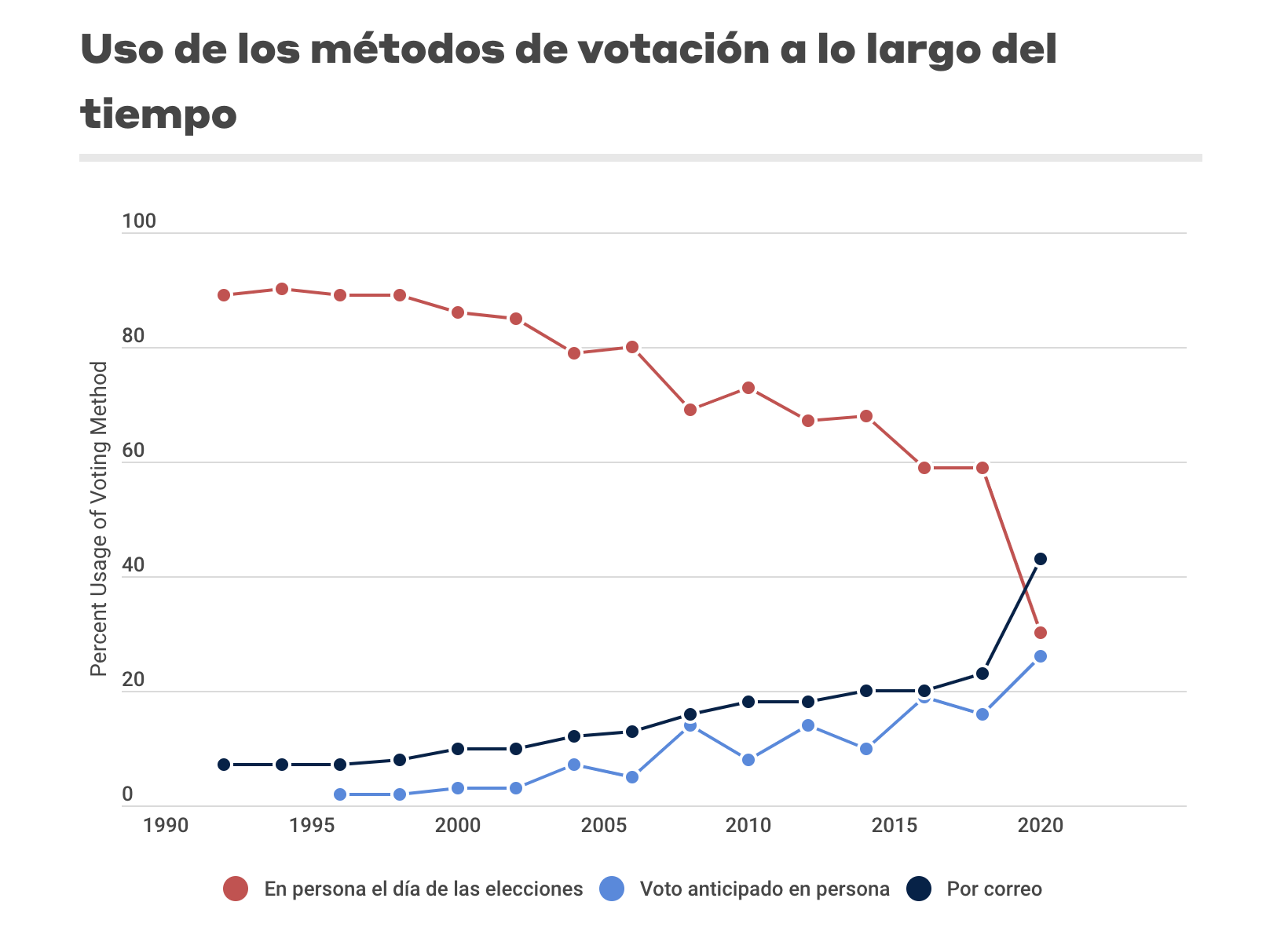 El uso del voto por correo ha ido en aumento desde la década de 1980, con un crecimiento sin precedentes a partir de la pandemia de COVID-19 de 2020.
